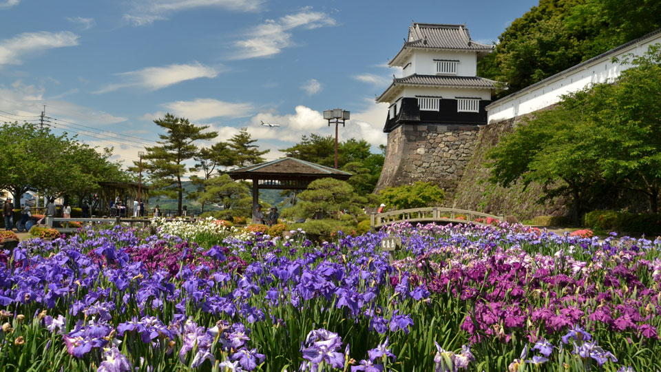 玖島城の長堀・南堀跡に九州最大級を誇る171種類約10万株およそ30万本の花菖蒲が咲き誇り、5月下旬から6月中旬まで、その優雅で気品ある姿を楽しむことができます。
