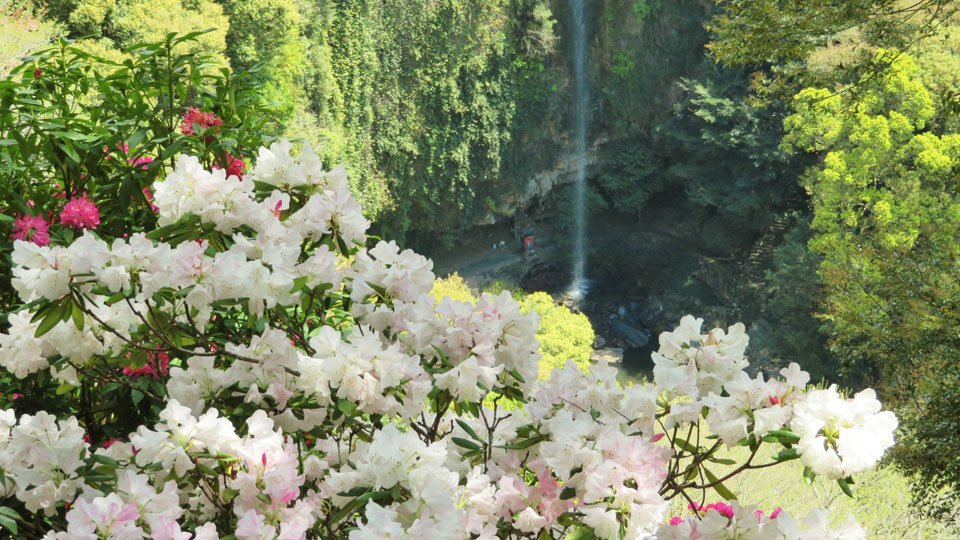 落差30mの滝を裏から見ることができることから裏見の滝と呼ばれ、滝周辺には世界のシャクナゲ約6000本が咲き誇ります。