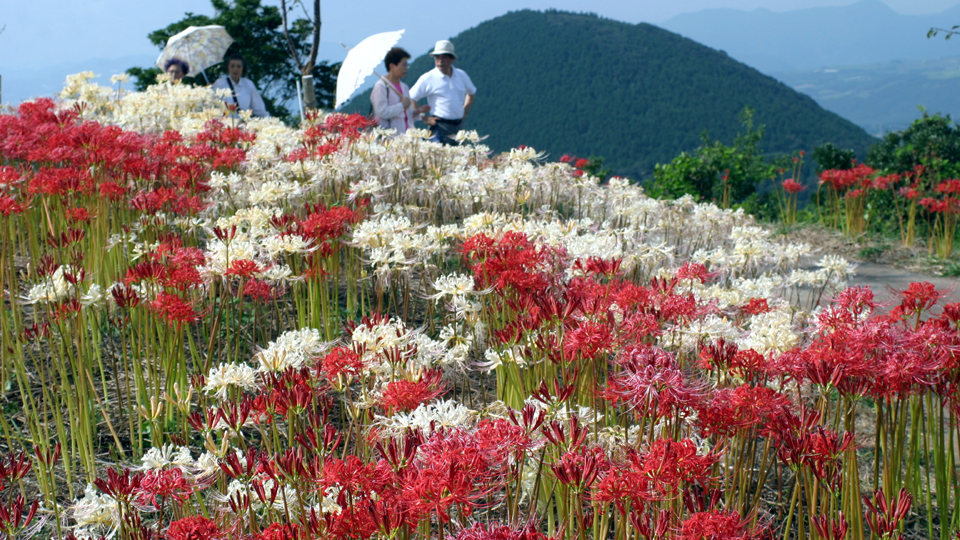 標高約300mの鉢巻山山頂は、360度の大パノラマが楽しめ、9月下旬、赤、白、クリーム色の彼岸花に彩られます。